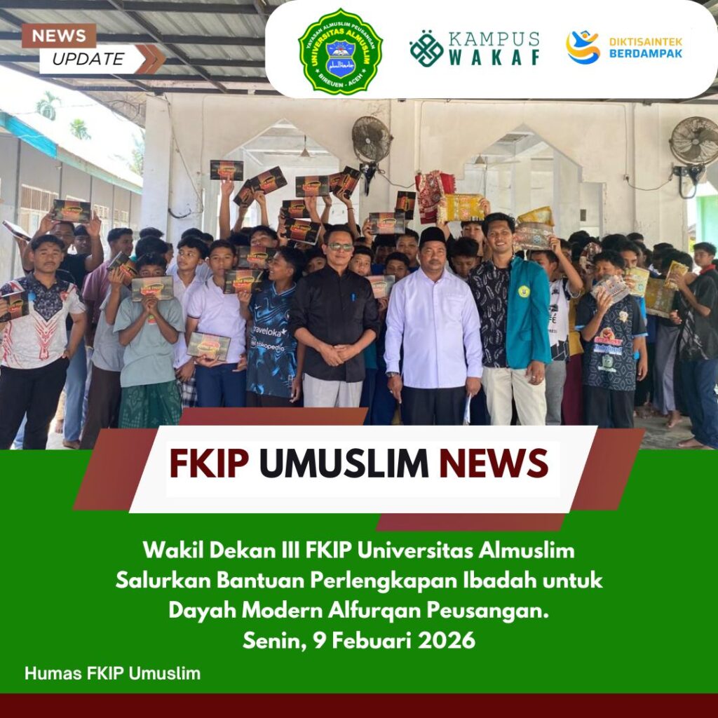 Bireuen – Wakil Dekan III Fakultas Keguruan dan Ilmu Pendidikan (FKIP) Universitas Almuslim, Dr. M. Danil, M.Pd., menyalurkan bantuan perlengkapan ibadah berupa mukenah, kain sarung, dan sajadah kepada Dayah Pesantren Modern Alfurqan yang berlokasi di Gampong Raya Tambo, Kecamatan Peusangan, Kabupaten Bireuen, pada Senin (9 Februari 2026).